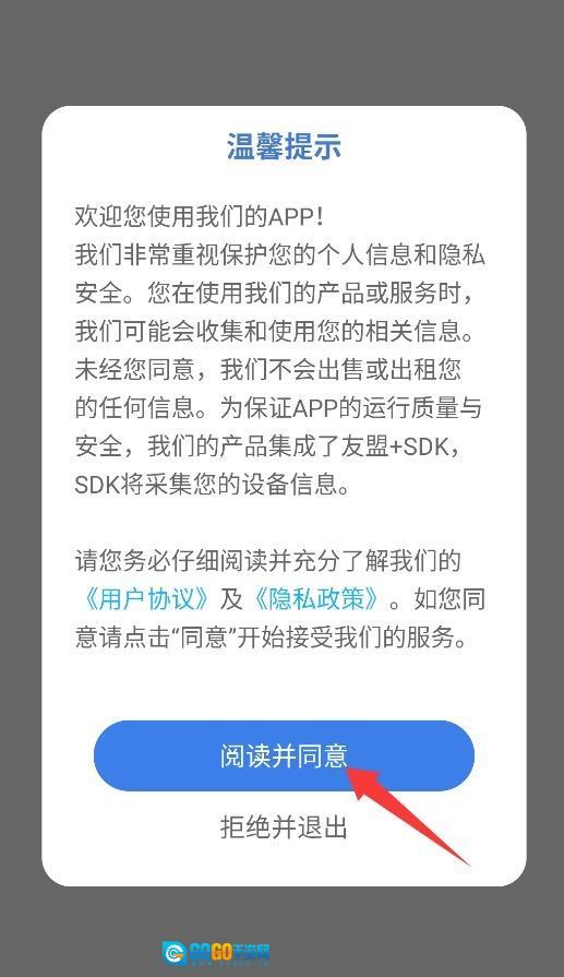 1、应用首次启动时会弹出温馨提示窗口,用户需点击同意按钮才能进入应用界面。