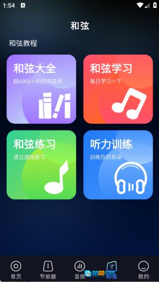 和弦页面包含和弦大全、和弦学习、和弦练习以及听辨训练这四大功能模块。