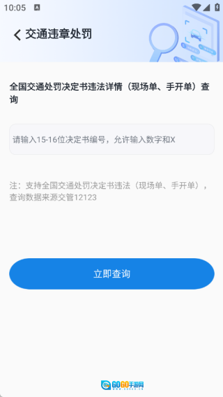 在交通违章处罚页面输入15至16位的决定书编号,接着点击立即查询按钮进行查询。