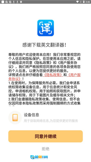 1、启动英文翻译工具,点击“同意并继续”按钮来开启使用流程。