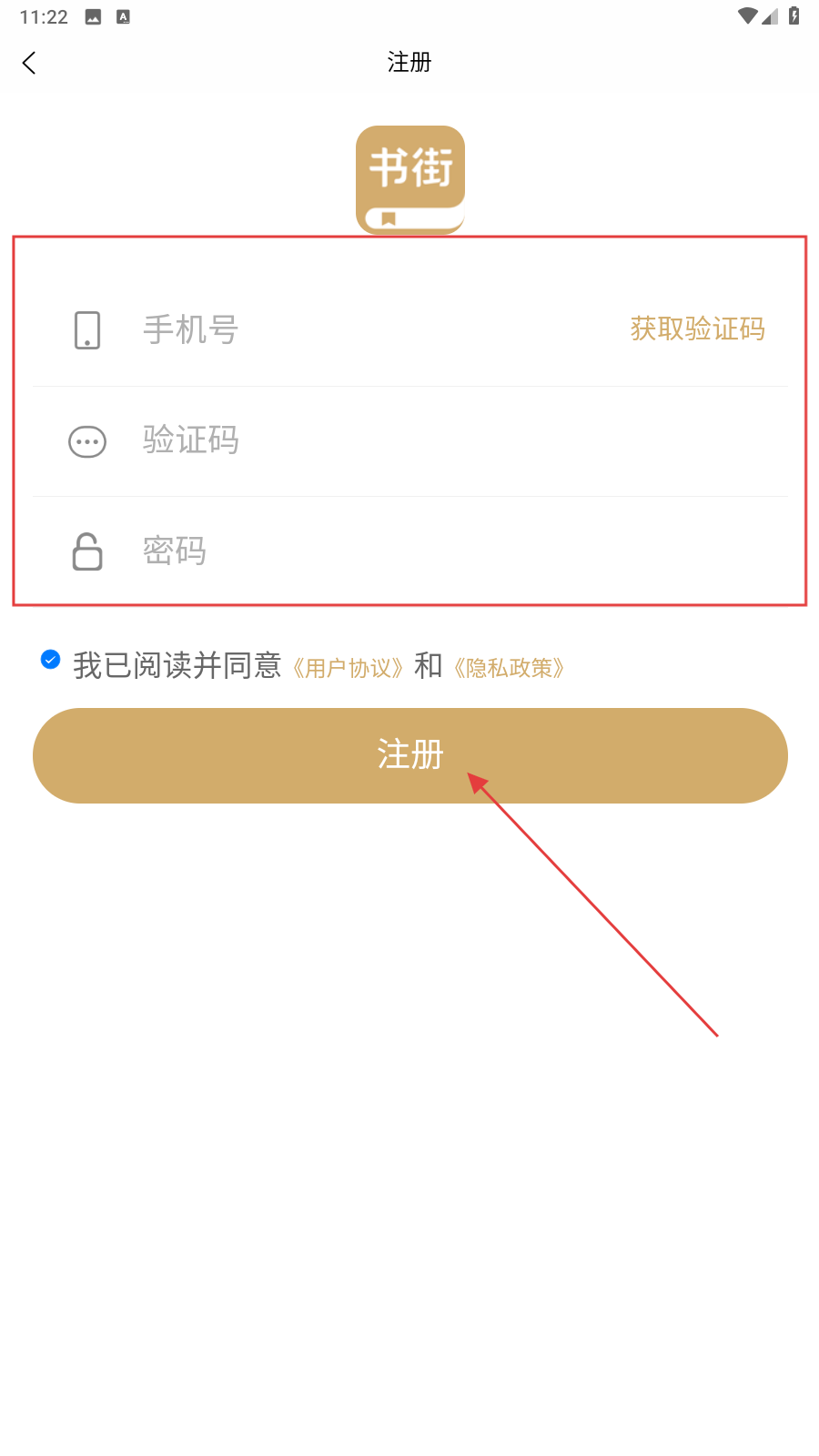 4、进入注册页面后,依次填写手机号、验证码与密码,随后点击【注册】按钮。