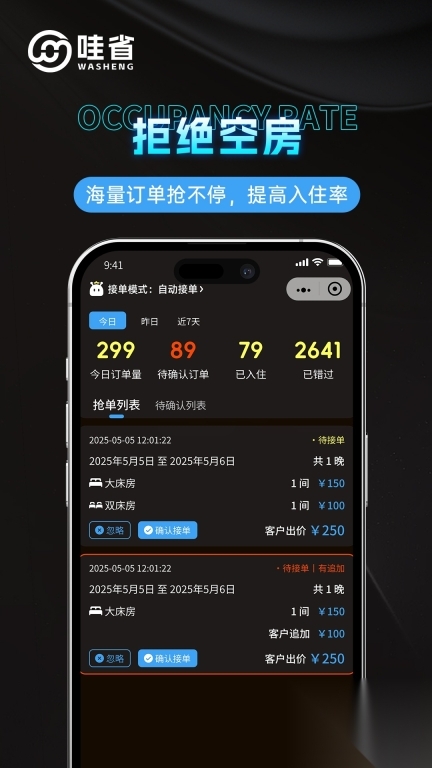 1、除自动接单功能外,还支持抢单模式,商户能够依据客户的出价、房型需求等条件,灵活地挑选订单。