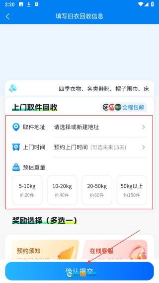 2、填取件地址、上门时间、预估重量等,点【确认提交】。