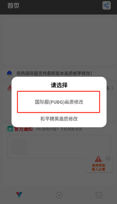 2、点击画质助手,系统会自动识别当前机型和游戏版本,之后会弹出两个选项供选择。