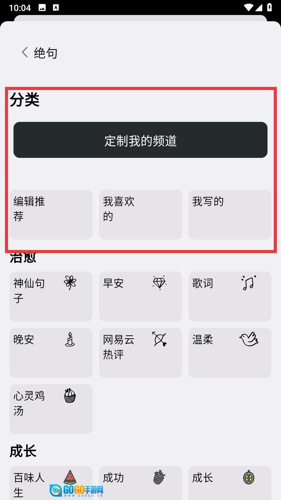 1、在分类页面,你可以点击【定制我的频道】,也能查看【编辑推荐】【我喜欢的】【我写的】等板块内容,便于筛选句子。