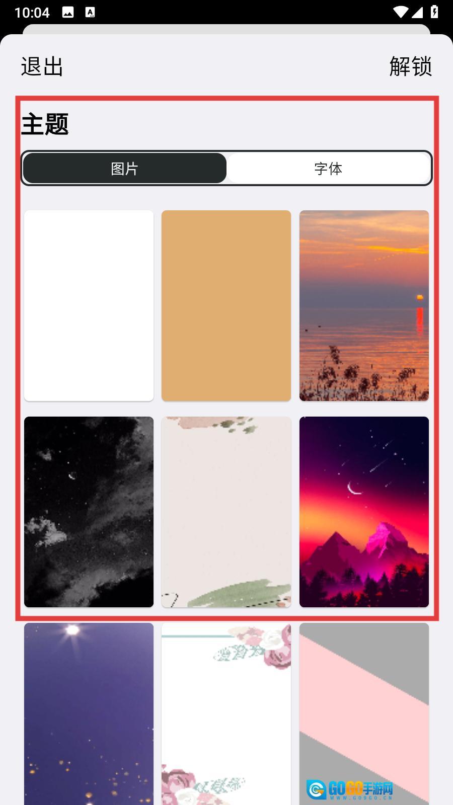 2、进入主题页面后,可选择【图片】或【字体】主题,更换心仪的背景,增强阅读时的视觉感受。