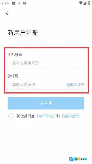 4、新用户在注册页面填写【号码】,点击【获取验证码】并输入验证码,勾选相关协议后点击【下一步】。