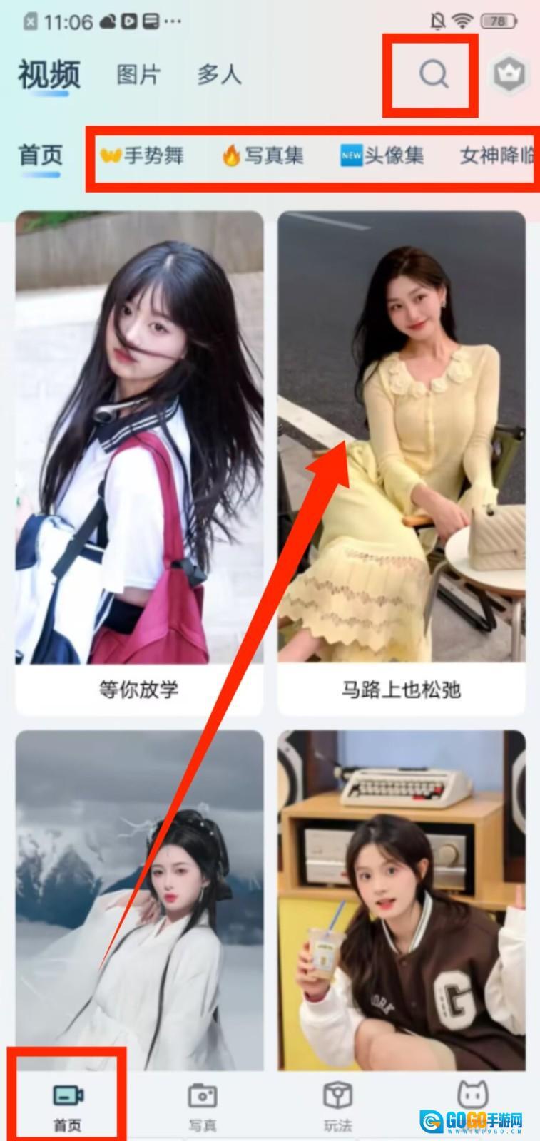 1、进入“首页”,可通过顶部搜索框查找内容,也能在手势舞、写真集等分类里浏览素材。