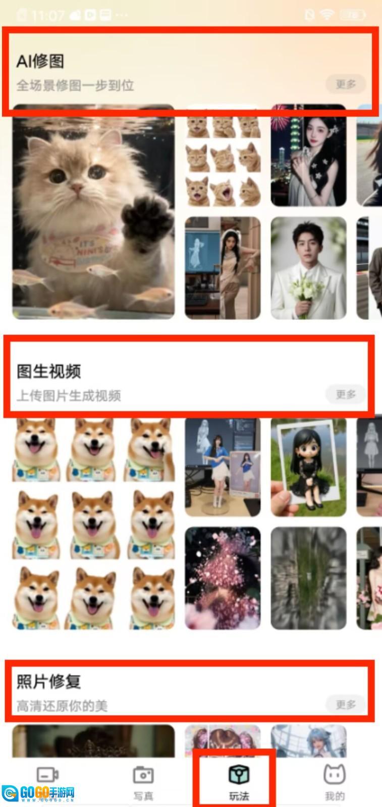 3、进入“玩法”页面,可体验AI修图、图生视频、照片修复等功能,点击“更多”查看完整选项。