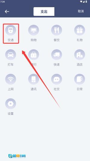 3、在第三张图的支出分类页面里,找到被红框标注的交通图标,点击这个带有公交车图案的圆形选项,以此来选定支出类别。