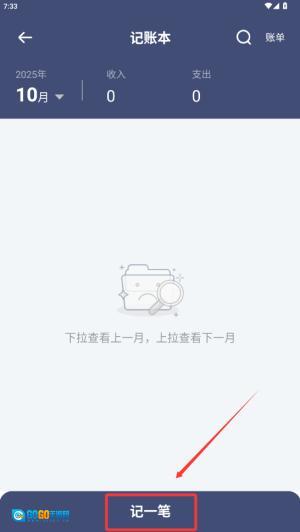 2、在第二张图的记账本页面底部,找到被红箭头指向的“记一笔”按钮,点击这个深蓝色的矩形按钮,即可开始新建记账条目。