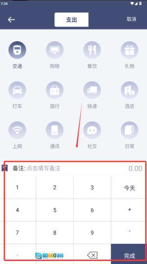 4、在第四张图的记账界面底部,通过键盘输入金额后,点击右侧的蓝色“完成”按钮,即可保存这条交通支出记录。