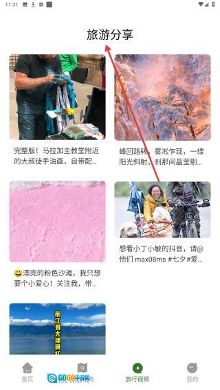 4、进入【旅游分享】页面,浏览他人发布的旅游经历内容。
