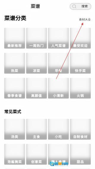 1、菜谱页点【食材大全】,进入食材分类。