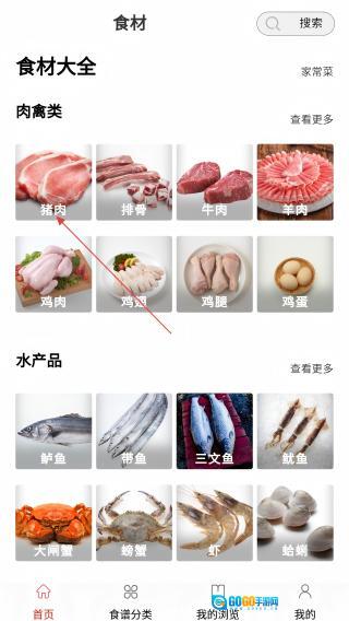 2、食材页选【猪肉】,查看猪肉做法列表。