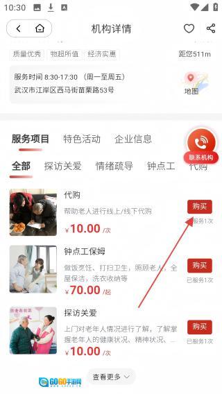 4、进入机构详情页,选择【代购】等服务,点击右侧【购买】按钮下单。