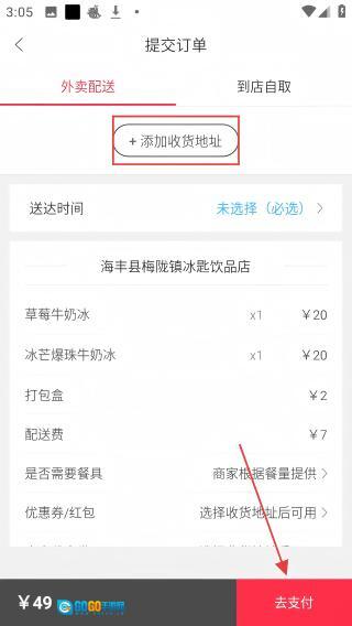 4、提交订单页点击【+添加收货地址】后,点【去支付】。