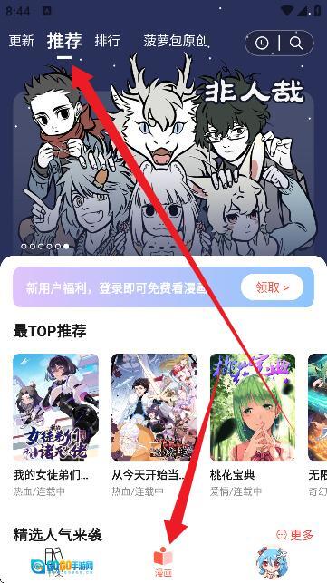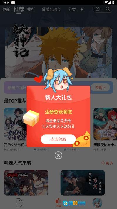 3、进入软件首页后,界面呈现如图所示的样子;首页会展示各类热门漫画推荐,也能通过分类功能查找自己喜欢的漫画类型,像热血、冒险、校园等都包含在内。此外,还可以查看排行榜,知晓当前最热门的漫画有哪些。