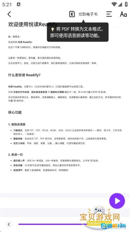 悦读最新版本2026是一款非常好用的电子书阅读与听书应用,支持PDF、EPUB、TXT等多格式书籍阅读,无需转换,即传即听,而且Readify的所有高级功能全部限时免费,无订阅、无隐藏收费、无使用限制,完全免费使用,有需要的朋友们快来游家软件园体验吧!