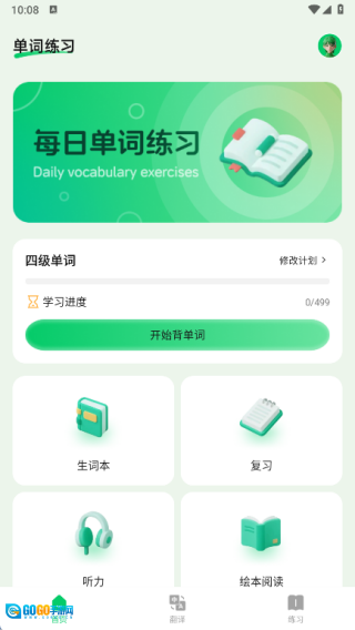 首页设有四级单词背诵练习功能,同时包含生词本、复习、听力、绘本阅读等多个版块。