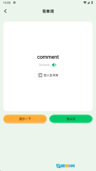2、点击“开始背单词”按钮,进入背单词页面后,可选择“我认识”或“提示一下”,也能将单词加入生词本。