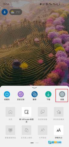 1、打开Edge浏览器,点击底部中间的菜单按钮,接着选择设置选项。