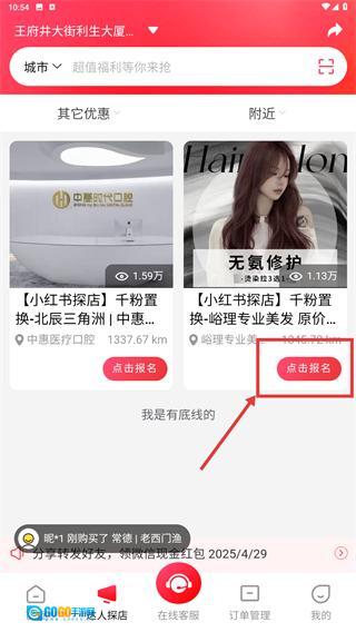 3、在探店推荐列表里找到目标活动后,点击【点击报名】按钮,进入对应的商家活动详情页面,即可参与该优惠活动。