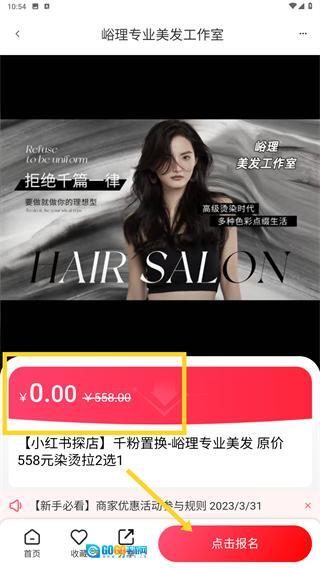 4、进入商家详情页面后,先确认活动相关信息(例如“0元享原价558元染烫拉服务”这类内容),接着点击页面底部的【点击报名】按钮,即可完成该优惠活动的参与步骤。