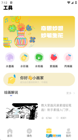 4、工具页面设有水墨画、水彩画、水粉画、素描画以及丙烯画版块,同时配备精彩的绘画解说内容。