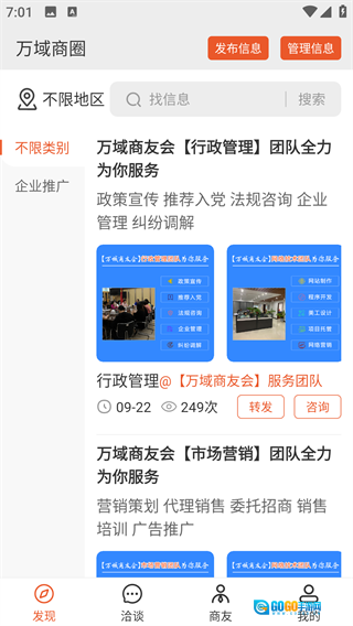 万域商友会是一款专门面向商业人士打造的在线交流与合作平台。它突破了传统社交软件需添加好友的限制,使不同行业、不同地区的商友得以迅速、直接地展开交流。平台整合了海量商业信息资源,覆盖产品销售、人才招聘、代理招商、连锁加盟、技术合作、项目融资等各类商业需求。