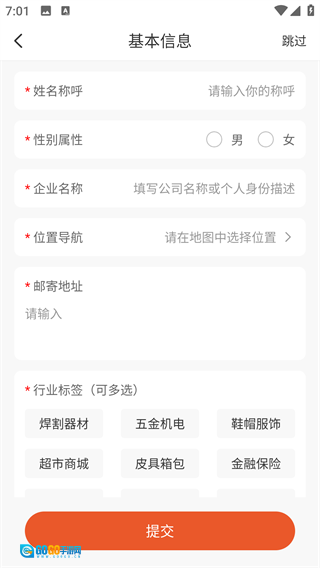 3、第一次登录时需要填写个人信息,其中包含行业标签、企业名称等内容;