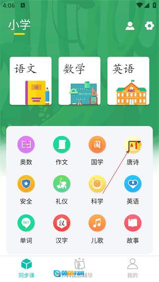 2、进入主界面后,找到并选择对应的学科板块(例如小学阶段),接着点击【唐诗】功能入口,即可进入唐诗学习页面。