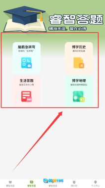 要是想挑战答题,就前往睿智答题页面,那里能看到各类题目模块,像脑筋急转弯、生活答题等,直接点击进入就能开始游玩。