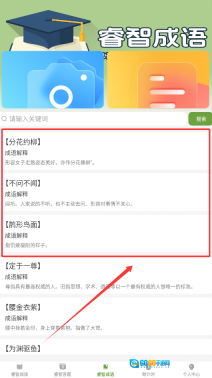 3、碰到不了解的成语时,可前往睿智成语页面,在顶部的搜索框中输入相关字词,下方会随即呈现出对应的成语及其详细释义。