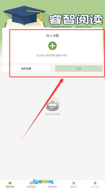 1、在主界面找到睿智阅读板块,点击板块中间白色导入书籍区域里的绿色加号,即可添加你喜爱的书籍。
