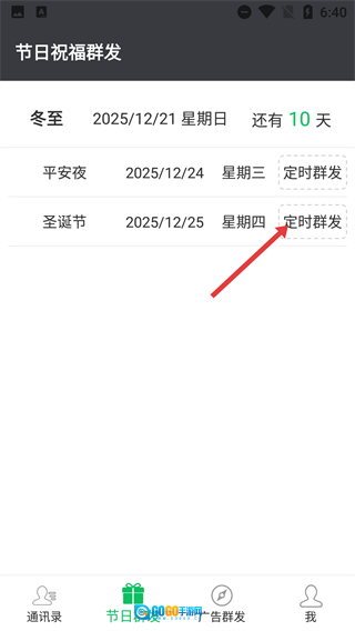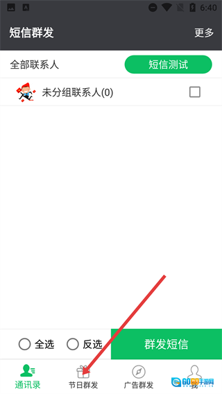 1、在短信群发的通讯录界面,点击底部的【节日群发】选项,即可进入节日祝福群发的专属页面。