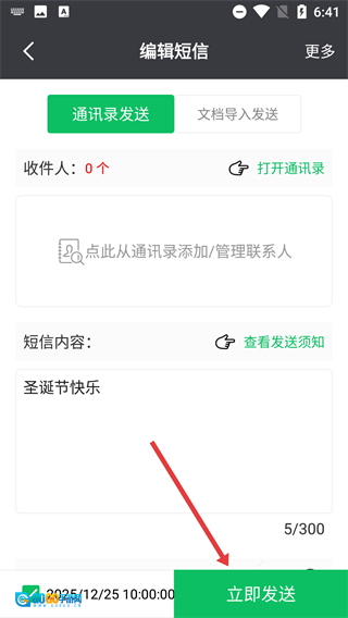 4、在确认好收件人、短信内容以及定时时间后,点击【立即发送】按钮,即可完成节日祝福的群发操作。