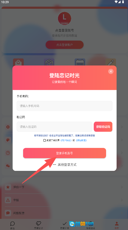 2、进入“登录恋记时光”页面后,输入手机号并填写验证码,以此完成账号登录操作。
