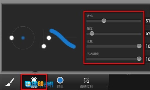 在软件里点击画笔工具后,我们就能对画笔的大小、硬度、流量和不透明度等参数进行调节。
