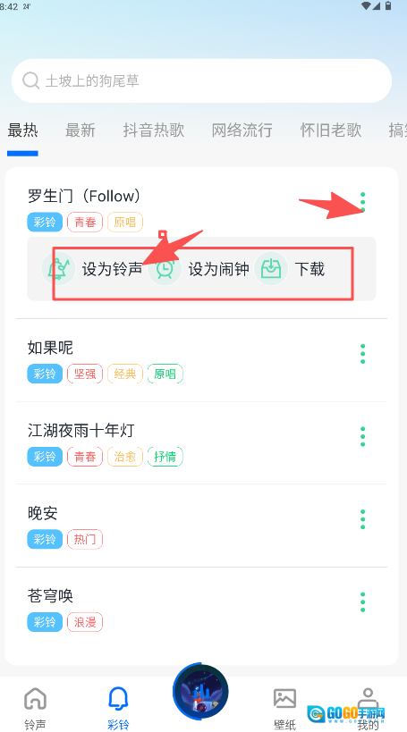 3、点击它右侧的“...”按钮,在弹出的操作菜单里选择“设为铃声”或者“设为闹钟”,这样就能完成设置了。