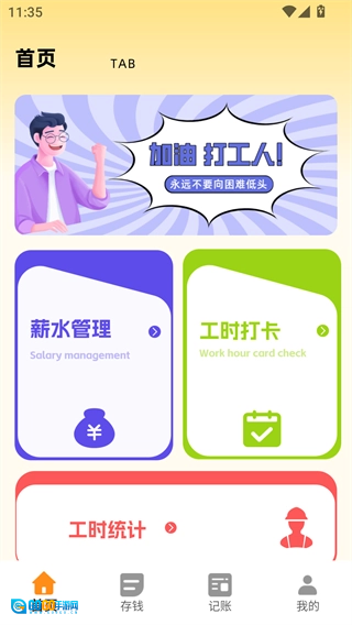2、在首页包含了薪水管理、工时打卡等功能入口;