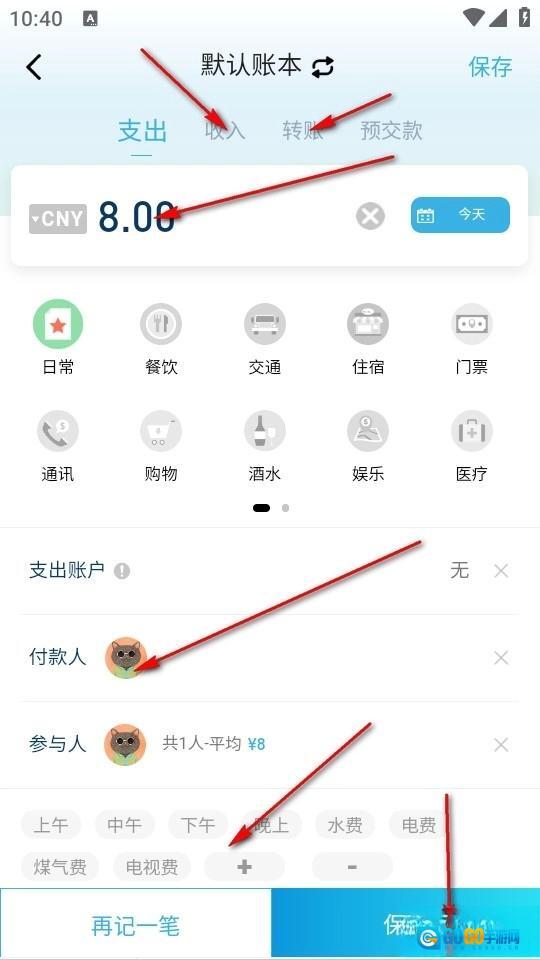 接下来我们选择消费项目、消费金额、付款人及参与人等信息,页面上方还能选择转账或收入记账模式,完成这些操作后点击保存即可。