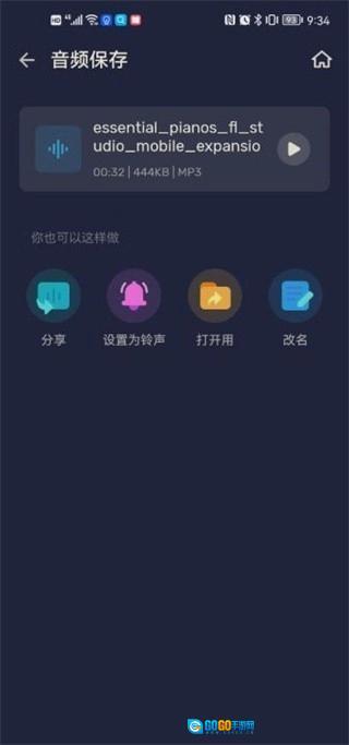 4、裁剪结束后能够试听并保存,同时支持一键快速分享、设置成铃声、更改名称等功能操作