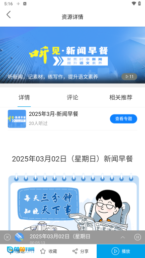4、点击并打开一条新闻,随即查看里面的音频列表并选择播放