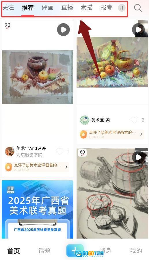 首页设有关注、推荐、评画、直播、报考等多个内容浏览板块。