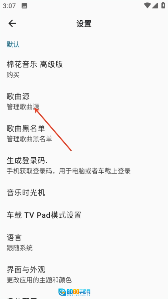 3、在设置菜单中选择“歌曲源”选项。
