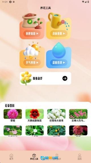 2、养花工具页面具备施肥浇水提醒、天气预报、湿度检测等实用功能,同时还提供免费的花草百科内容供用户分享与查阅。