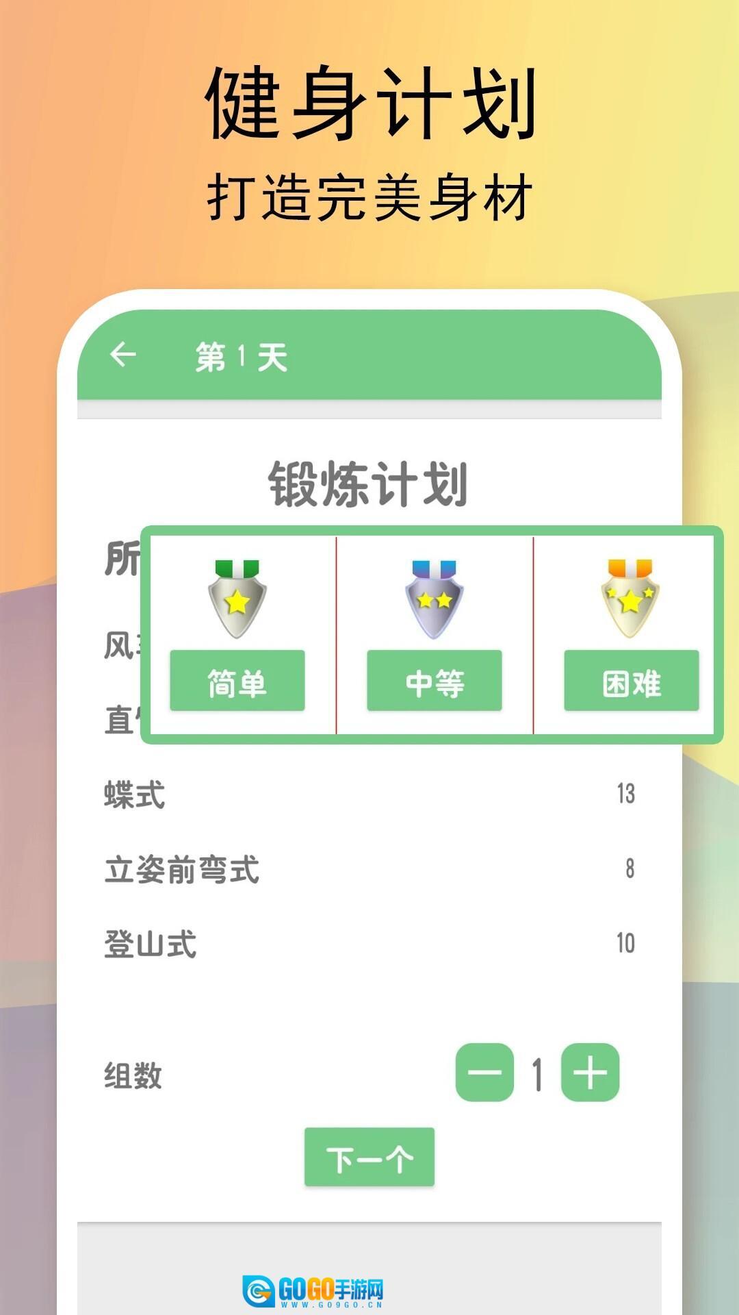 2、进入首页后,你得先依据自身的训练基础选一个健身计划。建议从简单的入手,要是觉得轻松,可选择中等难度或更高难度的,依此类推。