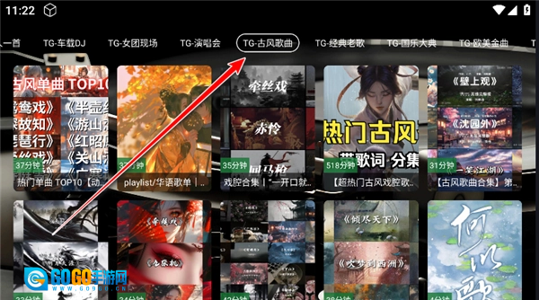 2.在这里,小编以点击TG-古风歌曲为例,点击后会出现很多古风类型的歌曲,接着我们可以点击自己喜欢的主题。