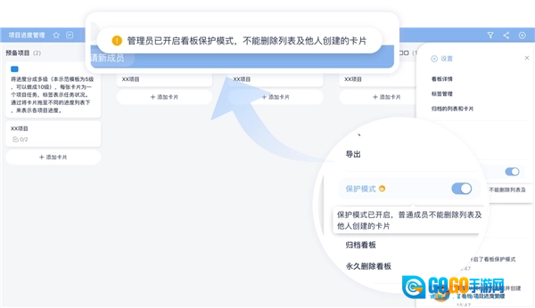 看板管理员可在「设置」中开启保护模式,限制普通成员删除他人创建的卡片和列表,以此避免多人协作时出现误删,更有效地保护看板内容的安全性。